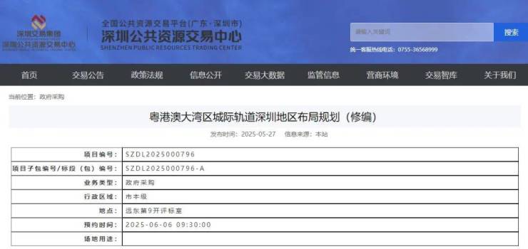 日前,深圳公共资源交易中心发布了粤港澳大湾区城际轨道深圳地区布局规划(修编)采购项目招标公告。
