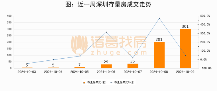 从存量房来看,2024年10月09日深圳存量房单日成交301套,比昨日增加100套,环比上涨49.8%。从近一周存量房成交来看,深圳存量房日均成交套数为83套,10月09日单日成交301套,高于近一周平均水平262.7%。