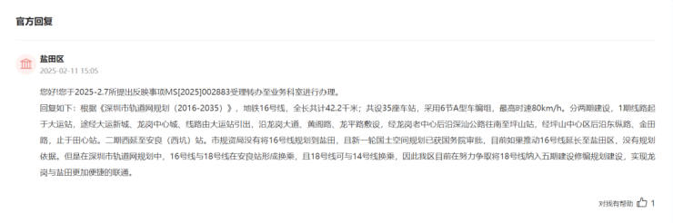 2月7日,有市民通过人民网“领导留言板”留言表示,“16号线期望能南延到盐田,这样东部到盐田就方便了”。据该市民留言,其建议将深圳地铁16号线南延至盐田,以方便深圳东部市民到盐田的出行需求。
