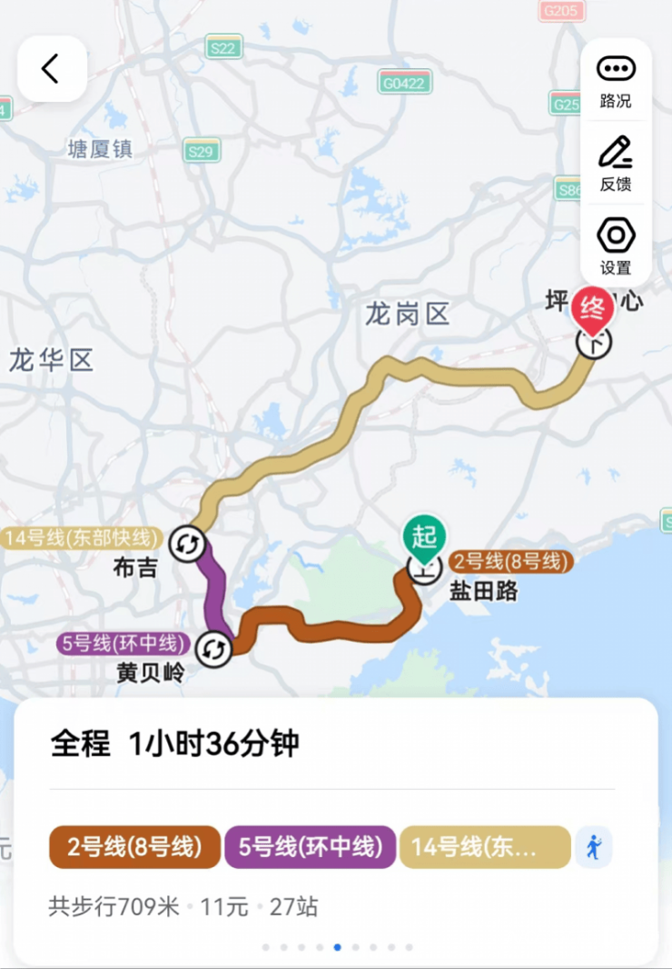 盐田路站至坪山中心站,全程耗时1小时36分钟。