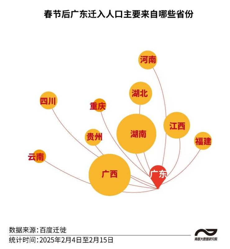 春节之后,广东的迁入人口主要来自哪些省份?百度迁徙的数据显示,迁入人口来源地主要有广西、湖南、江西、湖北、福建、河南、四川等地。其中,广西、湖南这两个邻近省份,从年初七开始,便长时间霸榜来源地top2的位置,约占广东迁入人口总量的五成。黄先生毕业于广州一所211大学,老家在广西南宁,大四时,他在天河区一家互联网公司做实习生,毕业后顺利入职。黄先生认为,与深圳、上海等城市相比,广州的房租较为合理,其他生活成本也不算太高。