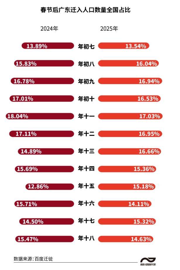 与去年相仿,今年春节后人口迁入广东的高峰也集中在正月初七(2月4日)至元宵节(2月12日)期间。其中,正月初七迁入比例为13.54%;正月十一达到最高峰,为17.03%,元宵节当天的迁入比例为15.18%。这些数据表明,广东作为全国经济大省,对外省劳动力的吸引力极为强劲。来自湖南衡阳的夏女士已在广州打拼十余年,现在越秀区一家金融公司做销售。她认为广州的文化很包容,是一个有活力的城市,在广州打拼的这些年,她认识了不少志同道合的伙伴,前两年刚刚买了房。