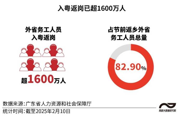 广东人社部门此前调查研判发现,2025年春节节前返乡务工人员比例为79.0%,节后返岗比例为94.7%,分别较2024年同期增加0.9个百分点、1.6个百分点,总体呈现“晚去早回、多去多回”的趋势特点。2月13日,据广东省人力资源和社会保障厅消息,截至2月10日,外省务工人员入粤返岗超过1600万人,占节前返乡外省务工人员总量的82.9%,同比提高0.7个百分点,有些企业已有超九成外省务工人员入粤返岗。