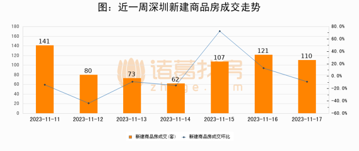 根据深圳市住房和城乡建设局数据显示,2023年11月17日深圳新建商品房成交110套,较昨日减少11套,环比下降9.1%
