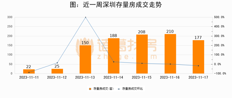 从存量房来看,2023年11月17日深圳存量房单日成交177套,比昨日减少33套,环比下降15.7%。从近一周存量房成交来看,深圳存量房日均成交套数为140套,11月17日单日成交177套,高于近一周平均水平26.4%。