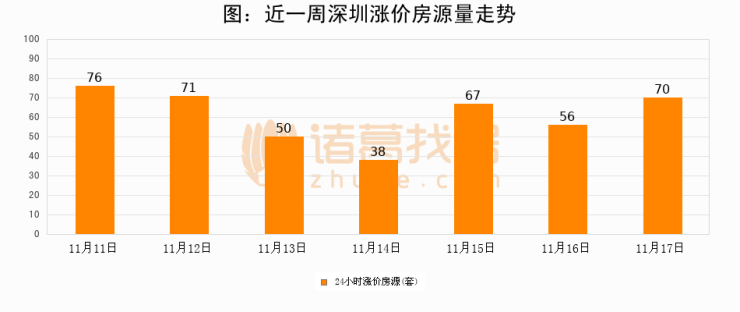 根据诸葛找房数据显示,深圳24小时涨价房源量为70套,较11月16日增加14套,环比上涨25%。与此同时,涨价房源占比小幅扩大,业主信心有所提升。