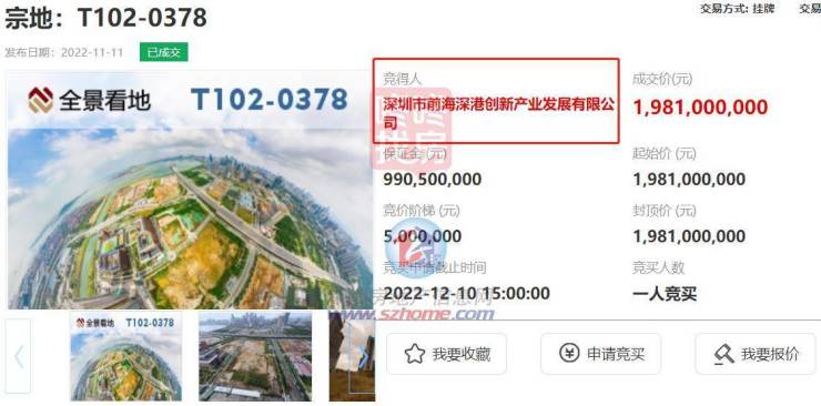 12月12日,该地由深圳市前海深港创新产业发展有限公司以底价19.81亿元竞得,该公司为深圳市前海建设投资控股集团有限公司(前海控股)全资子公司。