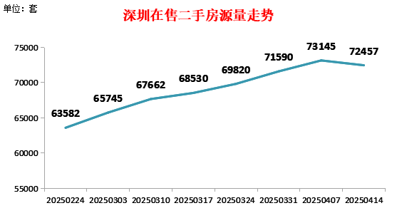 根据公开在售二手房源量数据统计,截至2025年4月14日,全市共有72,457套有效二手房源在售,较上周减少688套。其中龙岗较上周减少276套,有效在售18,917套,南山较上周减少200套,有效在售12,267套,福田较上周减少178套,有效在售10,280套。