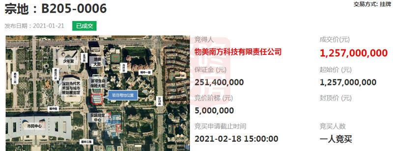 2月20日,物美南方科技有限责任公司以底价12.57亿成功竞得福田一宗商业用地,用于总部建设。
