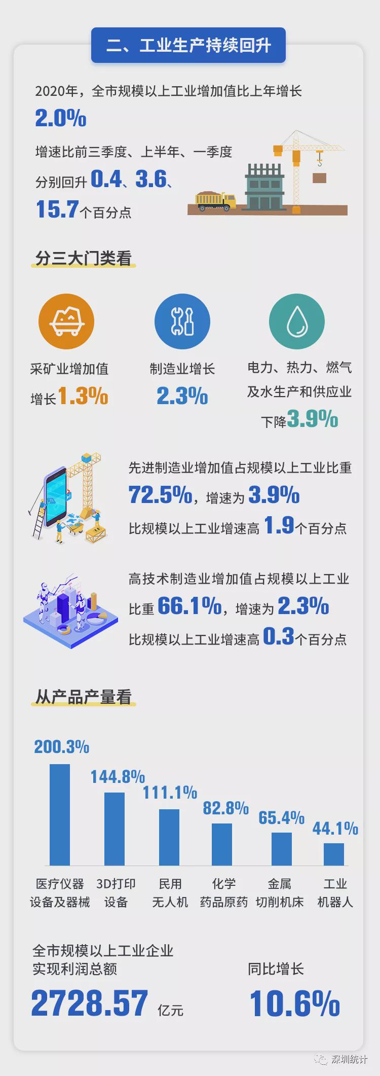 从产品产量看,医疗仪器设备及器械、3D打印设备、民用无人机、化学药品原药、金属切削机床、工业机器人同比分别增长200.3%、144.8%、111.1%、82.8%、65.4%、44.1%。全市规模以上工业企业实现利润总额2728.57亿元,同比增长10.6%。
