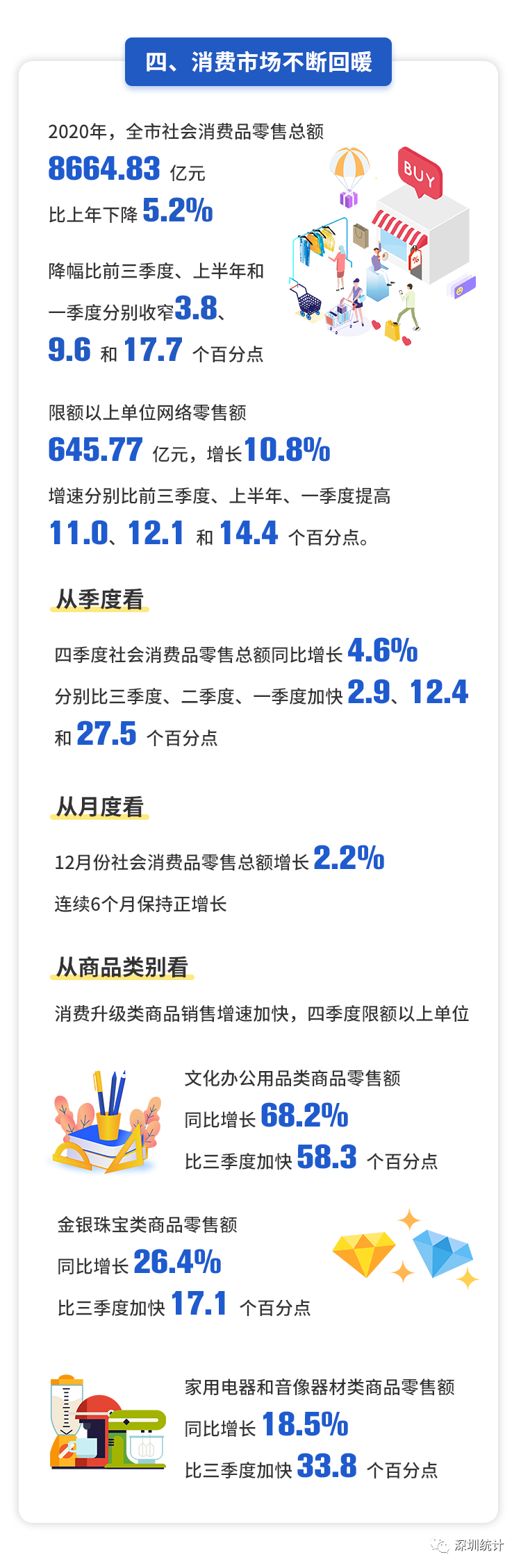 2020年,全市社会消费品零售总额8664.83亿元,比上年下降5.2%,降幅比前三季度、上半年和一季度分别收窄3.8、9.6和17.7个百分点。