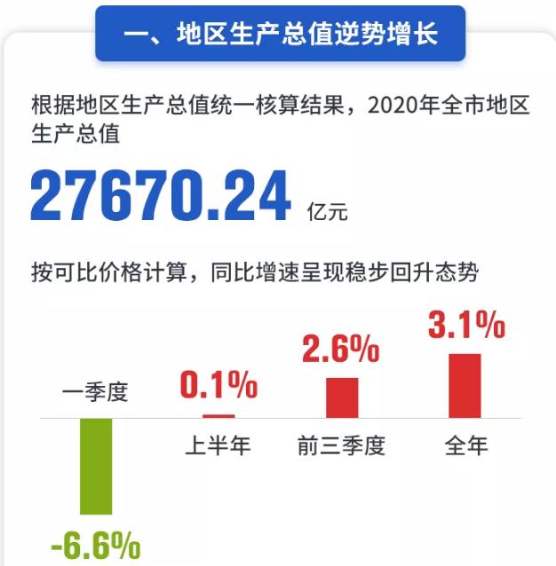 2020年全市地区生产总值27670.24亿元,按可比价格计算,同比增速从一季度的-6.6%、上半年的0.1%、前三季度的2.6%,提高到全年的3.1%,呈现稳步回升态势。
