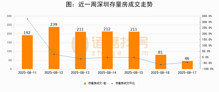 从存量房来看,2025年08月17日深圳存量房单日成交46套,比昨日减少35套,环比下降43.2%。从近一周存量房成交来看,深圳存量房日均成交套数为170套,08月17日单日成交46套,低于近一周平均水平72.9%。