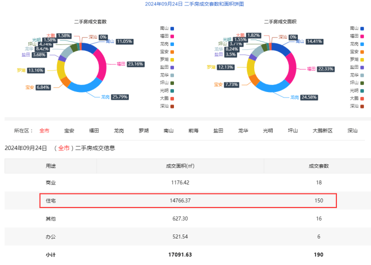 2024年9月24日二手房住宅网签150套。宝安9套;福田38套;龙岗40套;罗湖13套;南山21套;盐田5套;龙华13套;光明2套;坪山6套;大鹏3套。