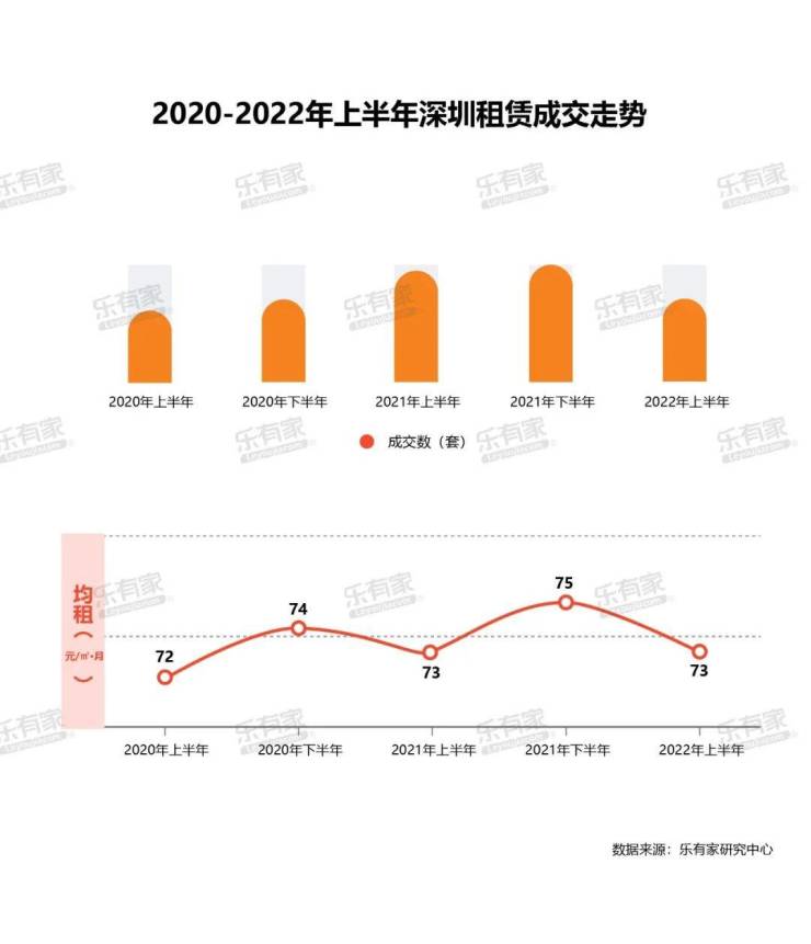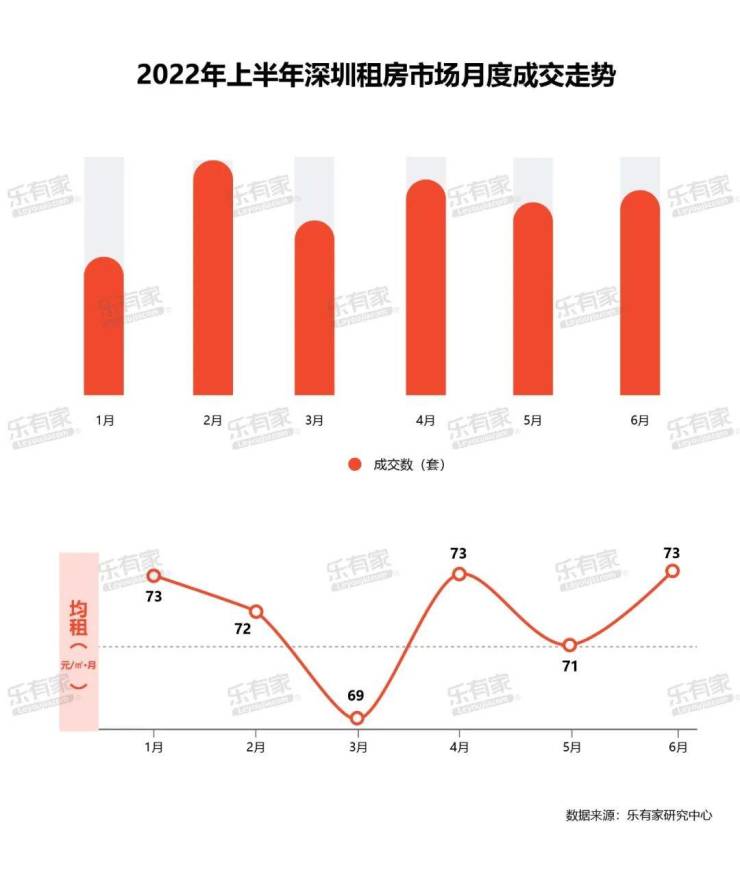 月度租赁成交上,1月是春节前期租赁量走低但价格稳定;3月是“疫情月”,量价齐跌。6月开始逐渐进入毕业季,租赁成交量有上涨趋势。全年的租赁成交高峰一般出现在三季度,当前深圳均租水平在73元/㎡·月。