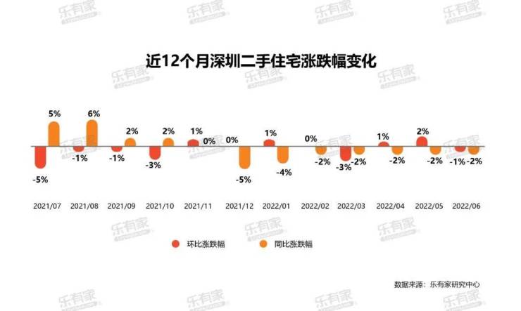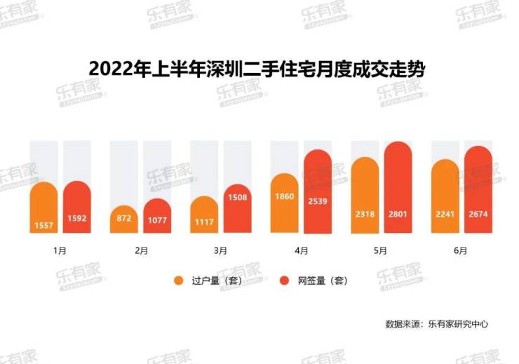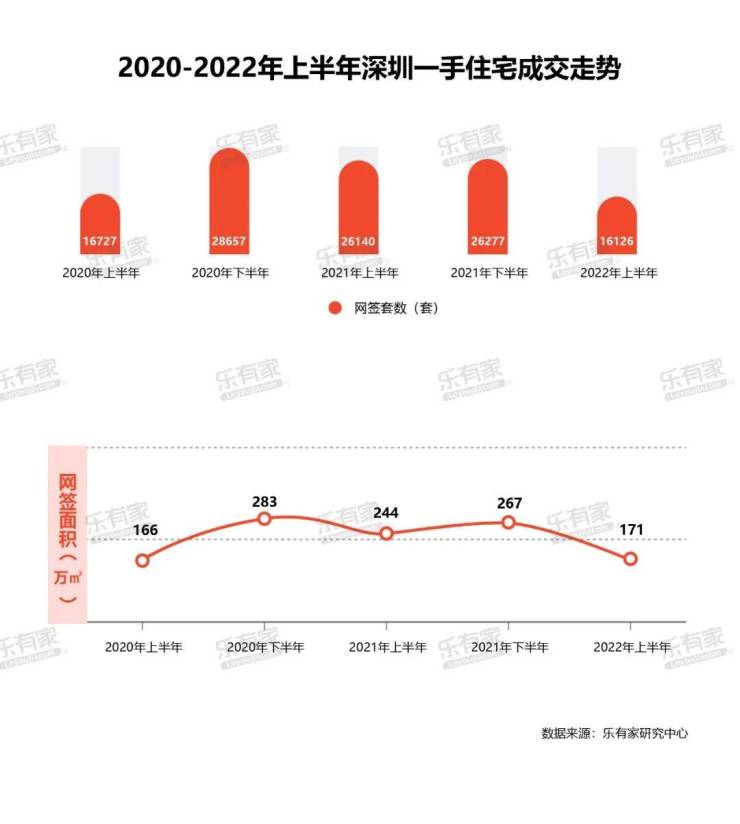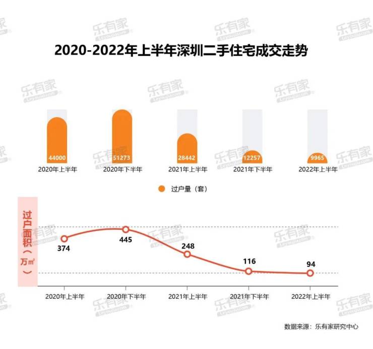 乐有家研究中心数据显示,2022年上半年,深圳新房住宅网签16126套,环比及同比的跌幅均达到4成;二手住宅过户不到万套,仅9965套,环比2021年下半年跌幅19%,同比跌幅65%。