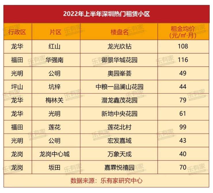 2022年上半年深圳热门租赁小区集中在龙华、龙岗和光明。其中龙华红山片区的龙光玖钻是商务公寓,但楼盘新、配套好,不少福田龙华上班的商务人士喜欢。福田华强南的御景华城花园在二手房交易市场深受购房者喜爱,在租赁市场也是租客一直的心头好。