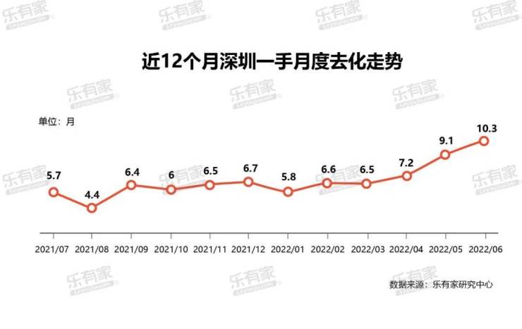 随着销量的走低,深圳新房市场的去化周期也逐渐走高。过去12个月里,深圳一手住宅去化周期从2021年7月的5.7个月,到2022年6月的10.3个月,近乎翻倍。当下,去库存不仅是深圳,更是全国各大城市新房市场的主要目标。