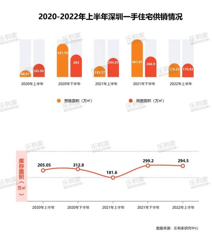 经历了2021年下半年的供应高峰期,2022上半年深圳各开发商入市步伐谨慎放缓。乐有家研究中心数据显示,2022年上半年全市新增住宅预售176.24万㎡,环比下跌63%,同比上涨32%;网签面积走低,仅170.83万㎡,环比减少36%,同比减少30%。截止到2022年6月30日,深圳一手住宅库存294.50万㎡,处于高位。