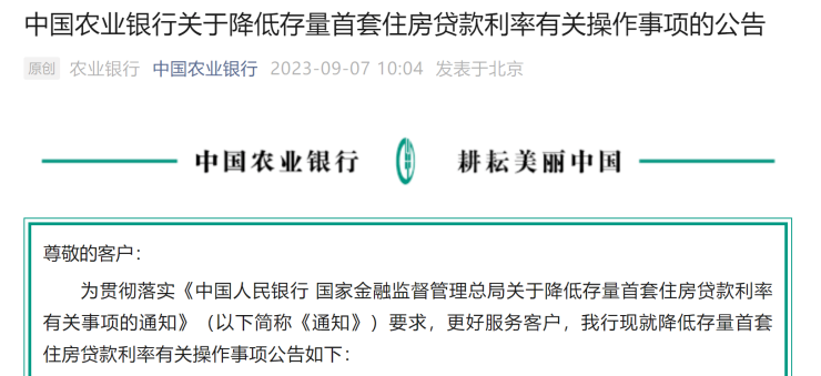 9月7日,农行、工行、中行先后在公众号、官网等平台发布《关于降低存量首套住房贷款利率有关操作事项的公告》,就调整范围、调整规则、申请方式等内容进行了明确。