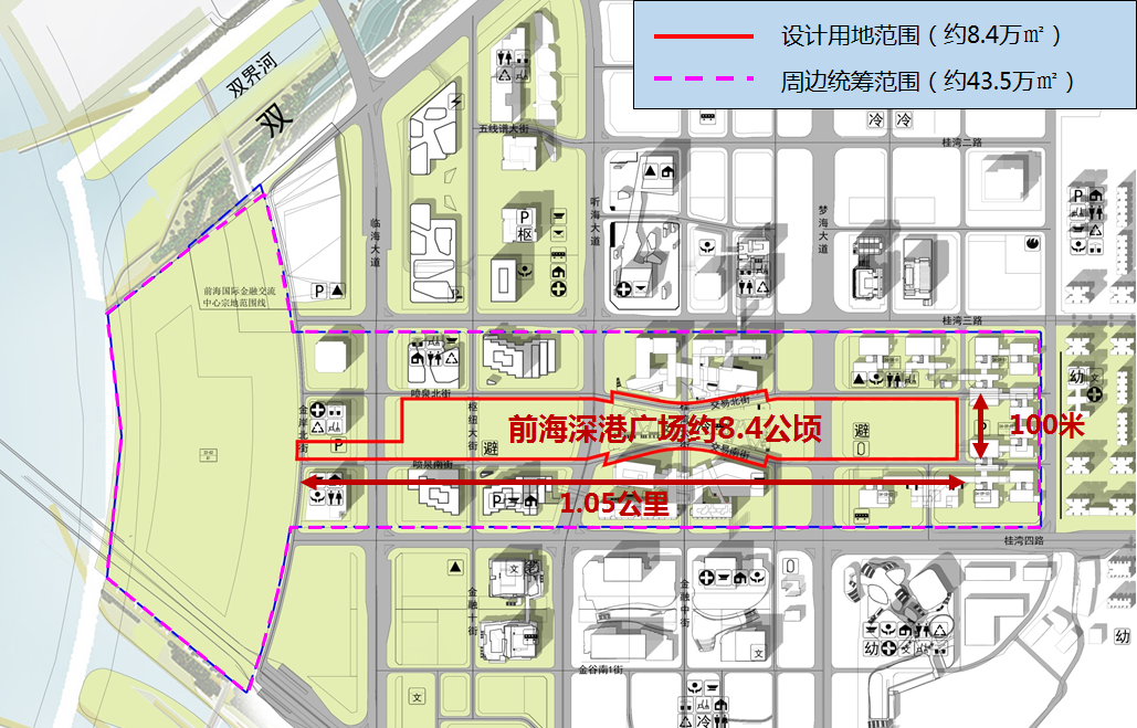 设计范围包括方案设计及协调范围,设计范围用地面积约8.4万㎡,周边统筹范围约43.5万㎡(不含深港广场设计用地范围)。