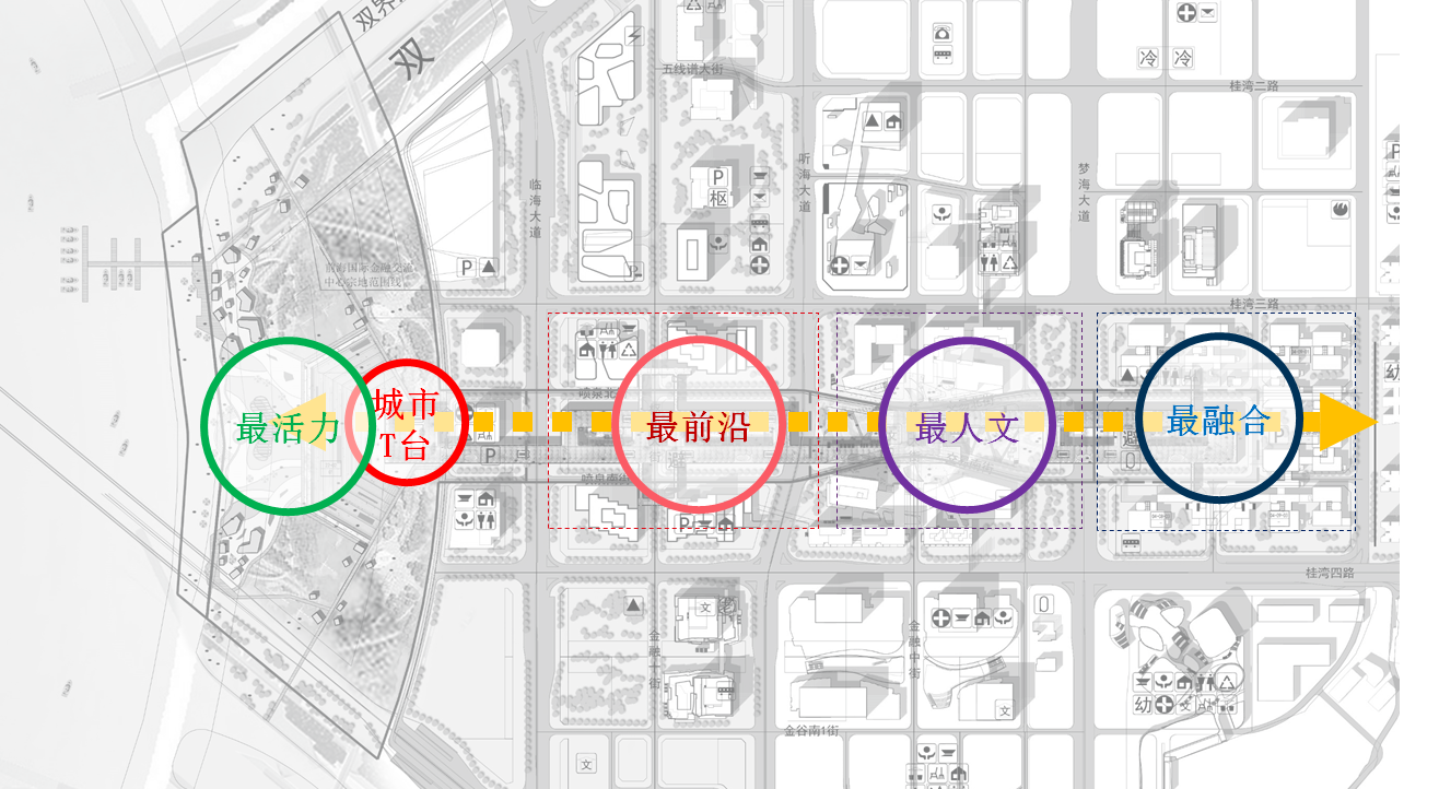 最活力区域——拟作为城市文化地标展示及公共活力功能,提供城市客厅、城市综合演艺秀场、文化广场、户外活动空间、教育空间等功能;