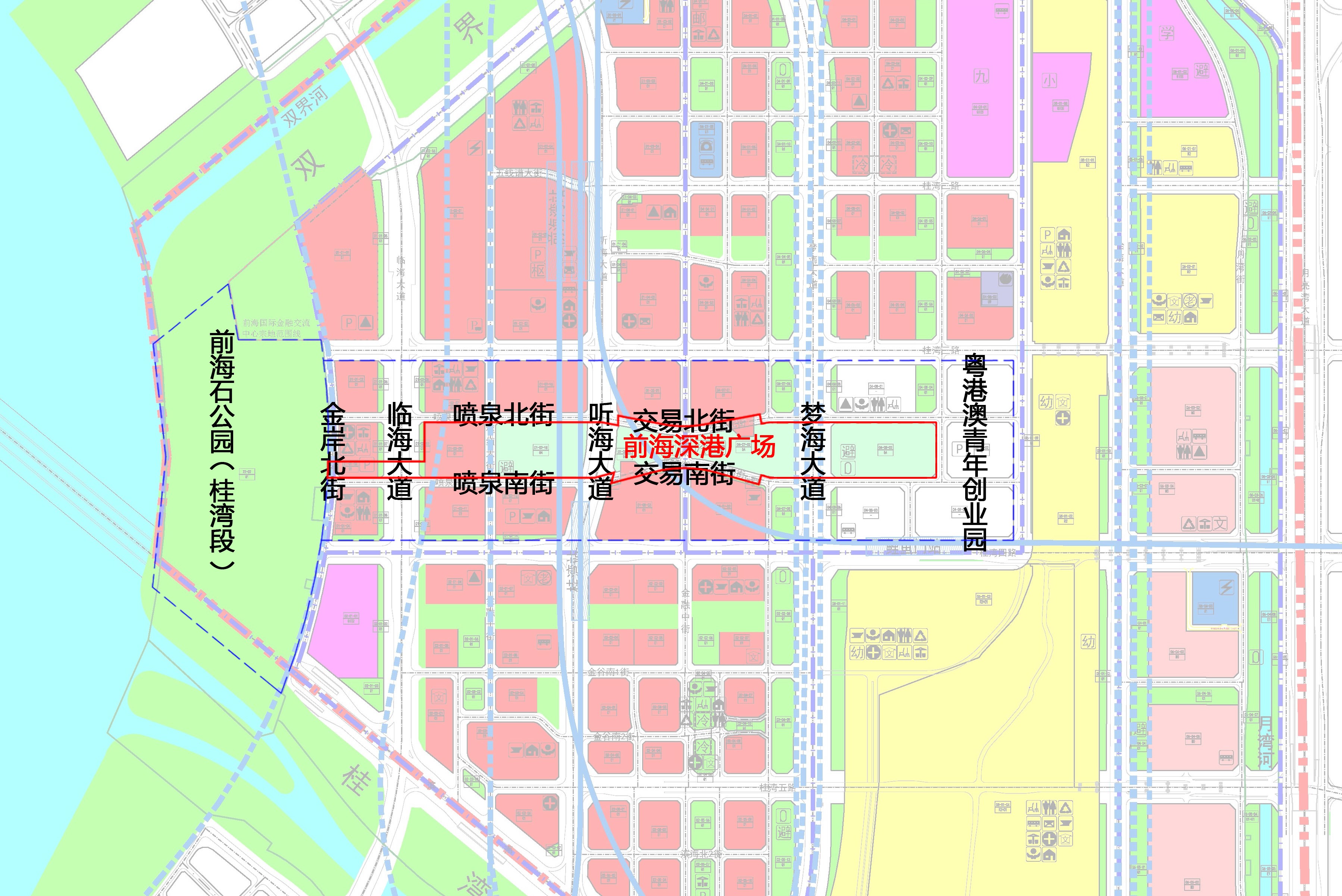 周边统筹范围包括与前海深港广场相关的周边项目,其范围约43.5万㎡(不含深港广场设计用地范围),包括前海石公园(桂湾段)、景兴海上广场及海上大厦、深铁前海国际枢纽中心项目(局部)、前海交易广场、粤港澳青年创业园。重点统筹地上及地下城市公共空间的衔接。