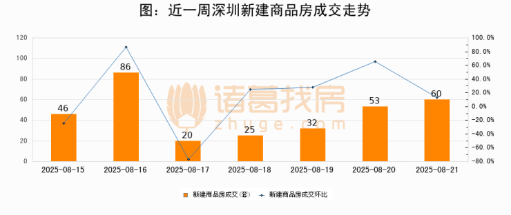 根据深圳市住房和城乡建设局数据显示,2025年08月21日深圳新建商品房成交60套,较昨日增加7套,环比上涨13.2%