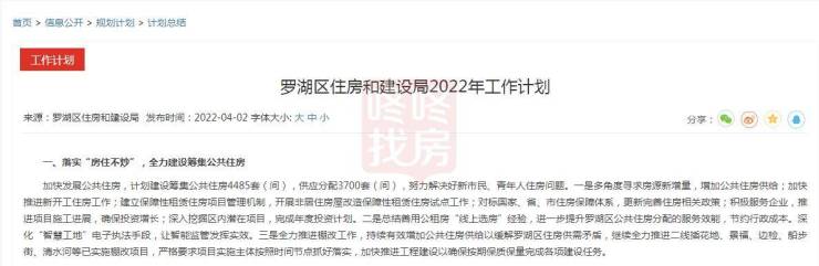 2022年,根据4月罗湖住建局发布的工作计划显示,罗湖加快发展公共住房,计划建设筹集公共住房4485套(间),供应分配3700套(间),努力解决好新市民、青年人住房问题。