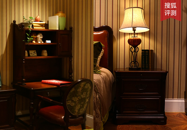 此卧室的其余配套家具同样别出心裁,典雅实用的小桌椅,怀旧经典的床头柜,温馨别致的灯饰,使卧室弥漫的浓浓美式风情更为厚重。