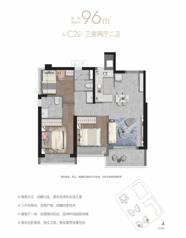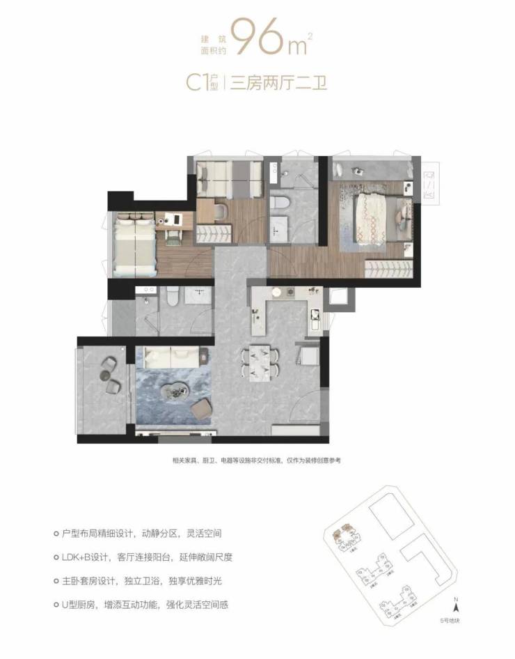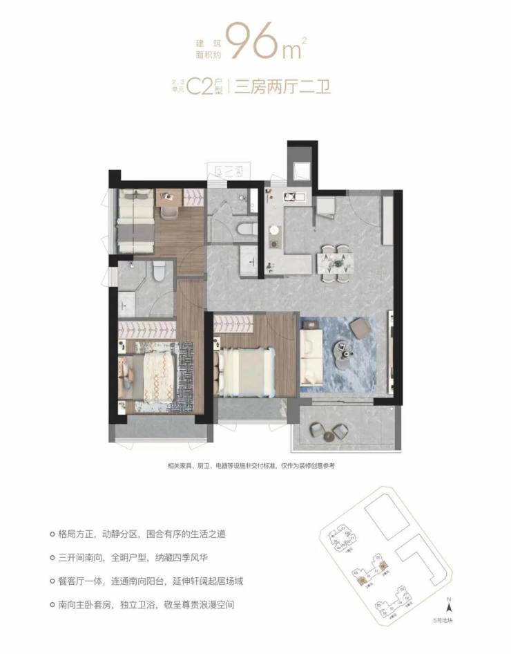 深铁瑞城二期户型产品比较纯粹,仅有96㎡、100㎡两个面积段,其中主要以建面约100㎡的户型为主。