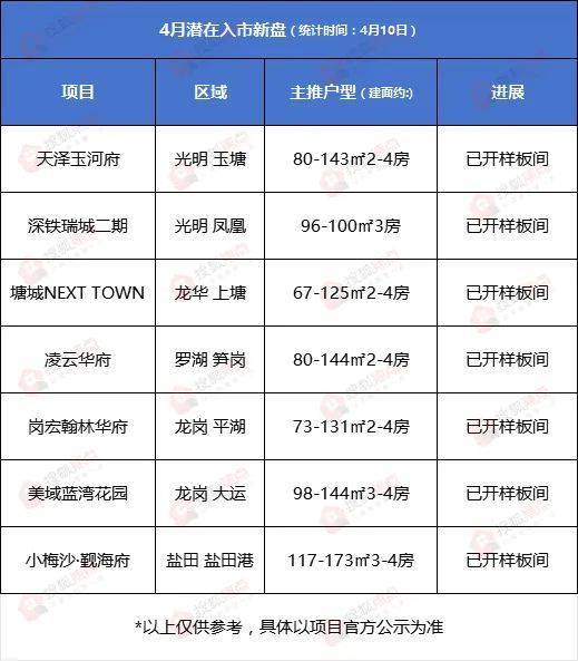 从潜在入市的项目来看,4月或为“刚需月”,所推产品多以光明、龙岗的刚需及刚改产品为主。