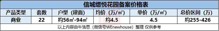 同时备案22套商业产品,建面约56-94㎡,均价约4.5万/㎡,单价均为4.5万/㎡,总价区间约255-426万/套。