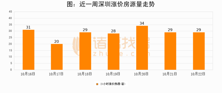 根据诸葛找房数据显示,深圳24小时涨价房源量为29套,较10月21日持平。
