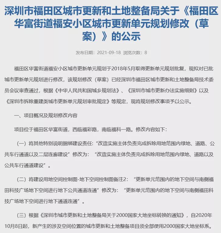 福田区华富街道福安小区城市更新单元规划于2018年5月取得更新单元规划批复,现拟对已批城市更新单元规划进行修改,该规划修改(草案)已经深圳市福田区城市更新和土地整备局技术委员会议审查通过,9月18日(今日),《福田区华富街道福安小区城市更新单元规划修改(草案)》公示。