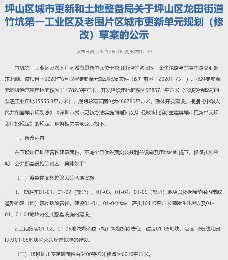 今日,坪山区龙田街道竹坑排名前列工业区及老围片区城市更新单元规划(修改)草案公示。
