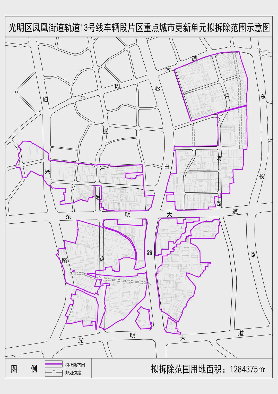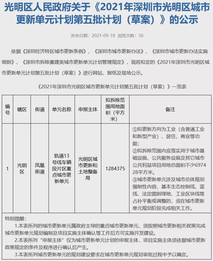 9月18日,《2021年深圳市光明区城市更新单元计划第五批计划(草案)》公示,其中光明区凤凰街道轨道13号线车辆段片区重点城市更新单元拟拆除范围用地面积1284375平方米,申报主体光明区城市更新和土地整备局。