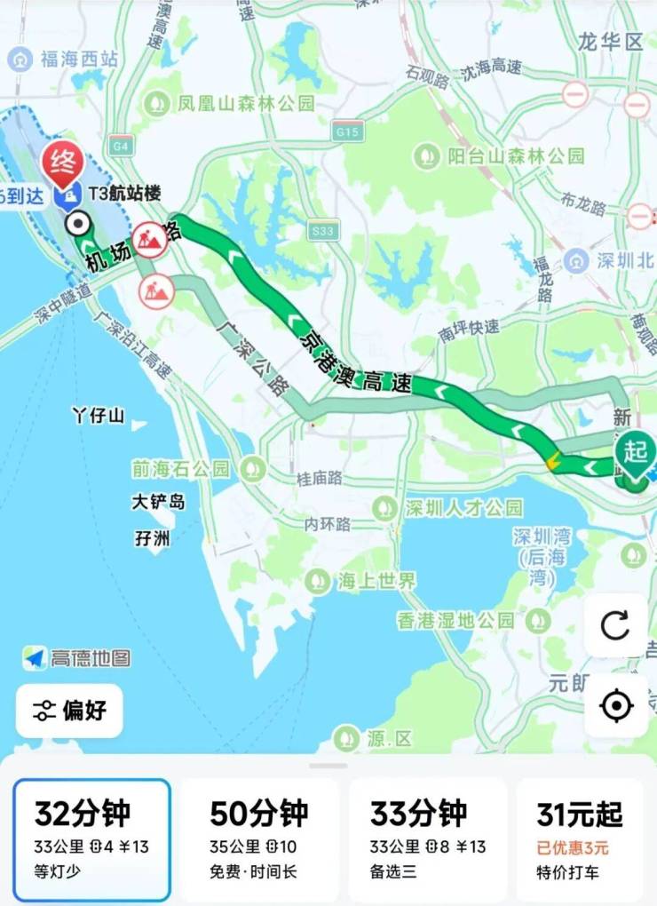 深圳机场东站紧邻深圳宝安国际机场,导航显示从福田出发,到达该地点最快只需要30分钟左右。
