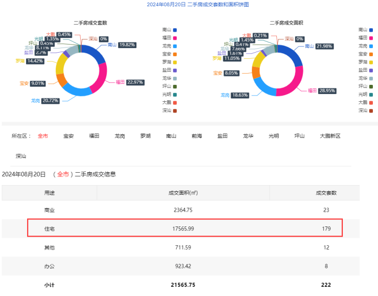 2024年8月20日二手房住宅网签179套。宝安18套;福田39套;龙岗38套;罗湖24套;南山38套;盐田3套;龙华15套;光明3套;坪山1套;大鹏0套。