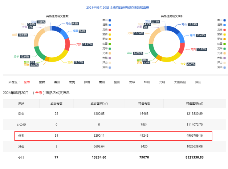 2024年8月20日新房住宅共网签51套。宝安11套;福田5套;龙岗6套;罗湖2套;南山5套;盐田0套;龙华8套;坪山3套;光明10套;大鹏0套;深汕1套。