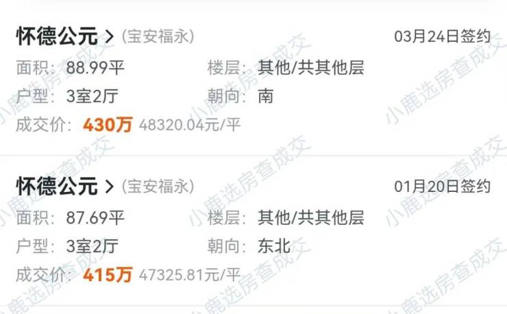 二手房方面,在二手房平台查询,德懿府周边怀德旗下两个二手房社区交易低迷,可查询到仅有今年年初的成交数据,是怀德公元二手房年初的成交价格在4.7-4.8万/㎡左右。(仅供参考,具体以实际为准)