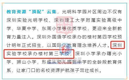 深圳实验学校承办楼村第三学校。也就是说,继深圳外国语学校被引入光明中心区后,光明中心区再次引入一家名校,深圳实验学校也将在光明中心区办学。