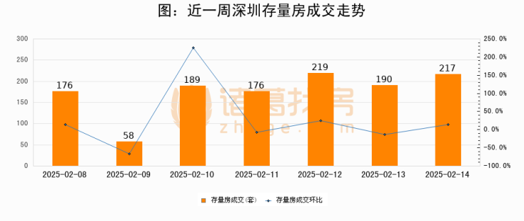 从存量房来看,2025年02月14日深圳存量房单日成交217套,比昨日增加27套,环比上涨14.2%。从近一周存量房成交来看,深圳存量房日均成交套数为175套,02月14日单日成交217套,高于近一周平均水平24%。