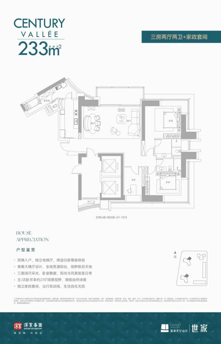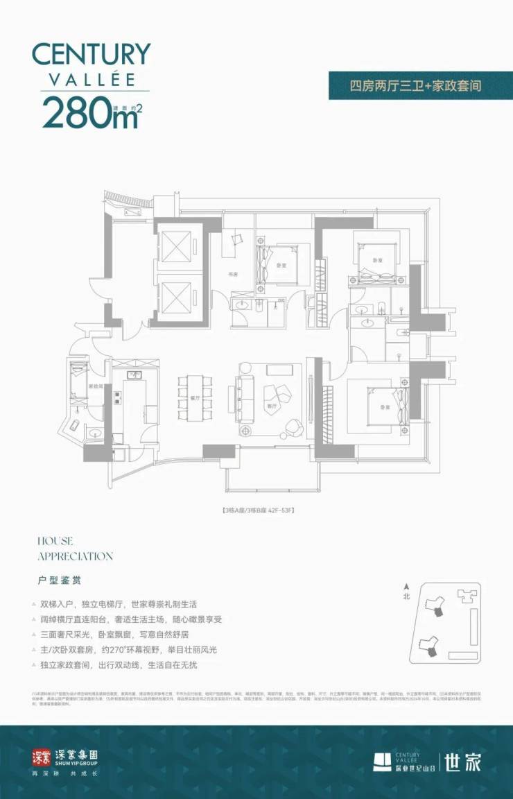 深业世纪山谷·世家产品为纯粹大面积阔宅,包括建面约233/280/386㎡大平层、420-1080㎡云端复式,不俗的总价门槛为业主圈层做了初步筛选。