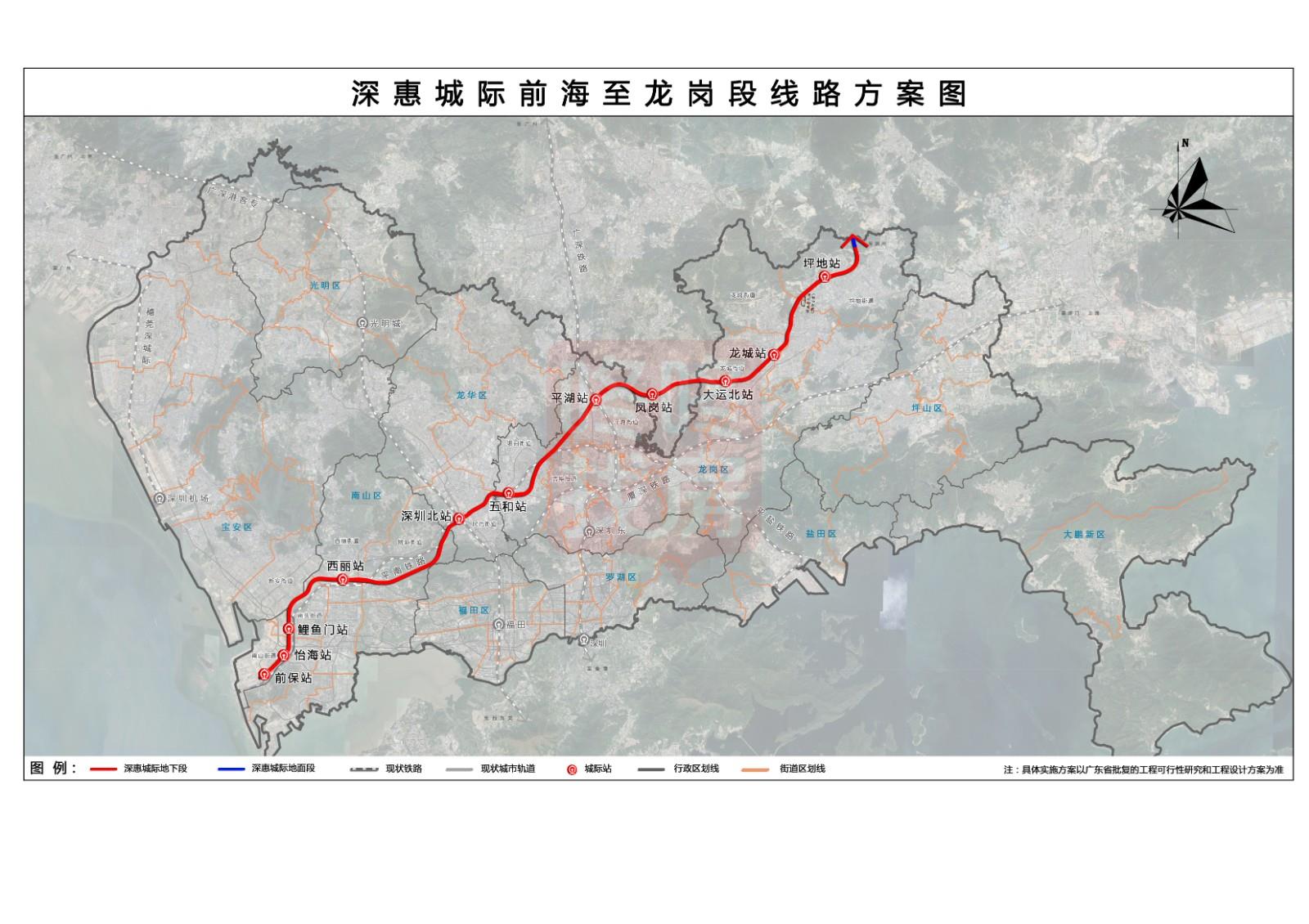 深惠城际前海至龙岗段:设前保、怡海、鲤鱼门、西丽、深圳北、五和、平湖、凤岗、大运北、龙城、坪地共11座车站。全长约62.8公里,设计速度160公里/小时。