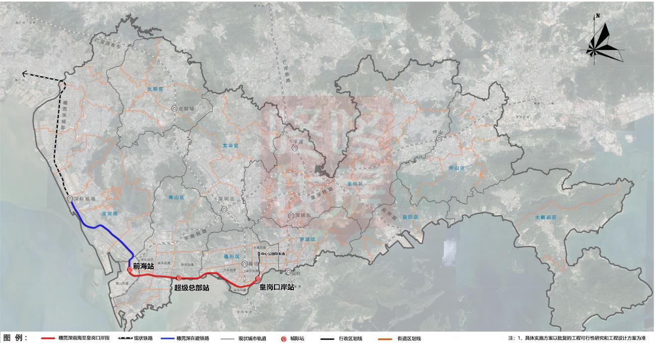 穗莞深城际(前海至皇岗口岸段):设超级总部站、皇岗口岸站。线路全长 21.167 公里,速度目标值为 160km/h。