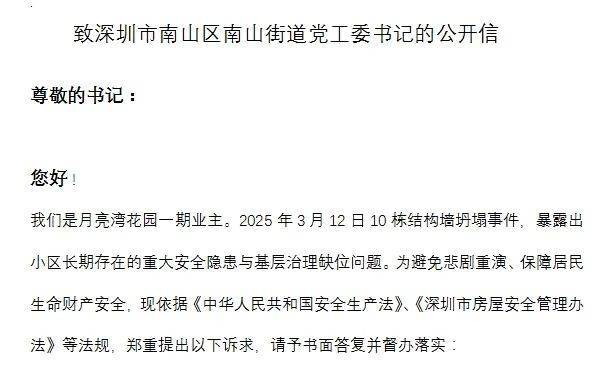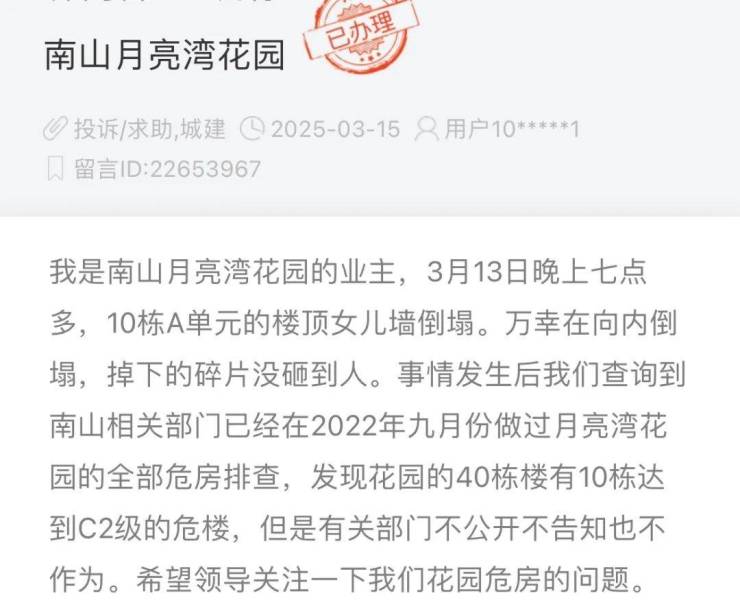 接到反映后,街道办回复已联合区住建局、专业机构对10栋及小区其余41栋女儿墙开展全面排查,同时将依据《深圳市房屋安全管理办法》,推进隐患整治。