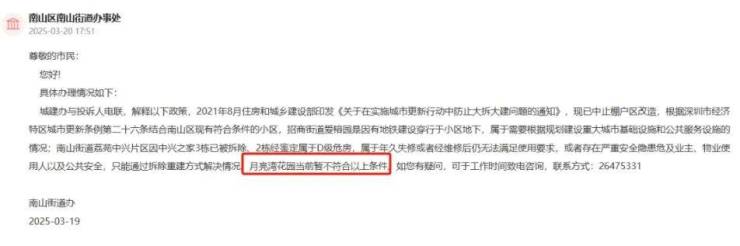但据南山区南山街道办事处的最新回复,月亮湾花园当前暂不符合“拆除重建方式解决情况”的条件。
