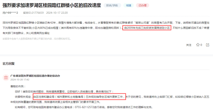 有业主在领导留言板上表达想要“加速小区旧改速度”的想法。相关部门回应称“如后续红裙楼小区被纳入区五年规划拆除重建的更新范围,我街道将依据上级相关主管部门的要求开展工作。”