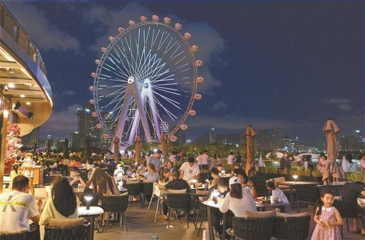 不远处的摩天轮脚下,“湾区之光”摩天轮的灯光秀美轮美奂,点亮浪漫夜空。庆典广场的《鲲鹏之梦》主题水秀表演采用3D投影带领游客开启寻光之旅。融滨海文化旅游娱乐商业于一体的欢乐港湾自开业起就晋升西部“顶流”,其拥有亚洲最高的摩天轮、长达1公里滨海风光休闲带,共同构筑起深圳市首个湾区亲海体验式商业街区。2022年欢乐港湾被评为中国文旅商综合体欢乐指数百强榜榜首。今年五一假期,累计接待人数超50万人次,单日接待游客人数连续5天排名全市景区第一。